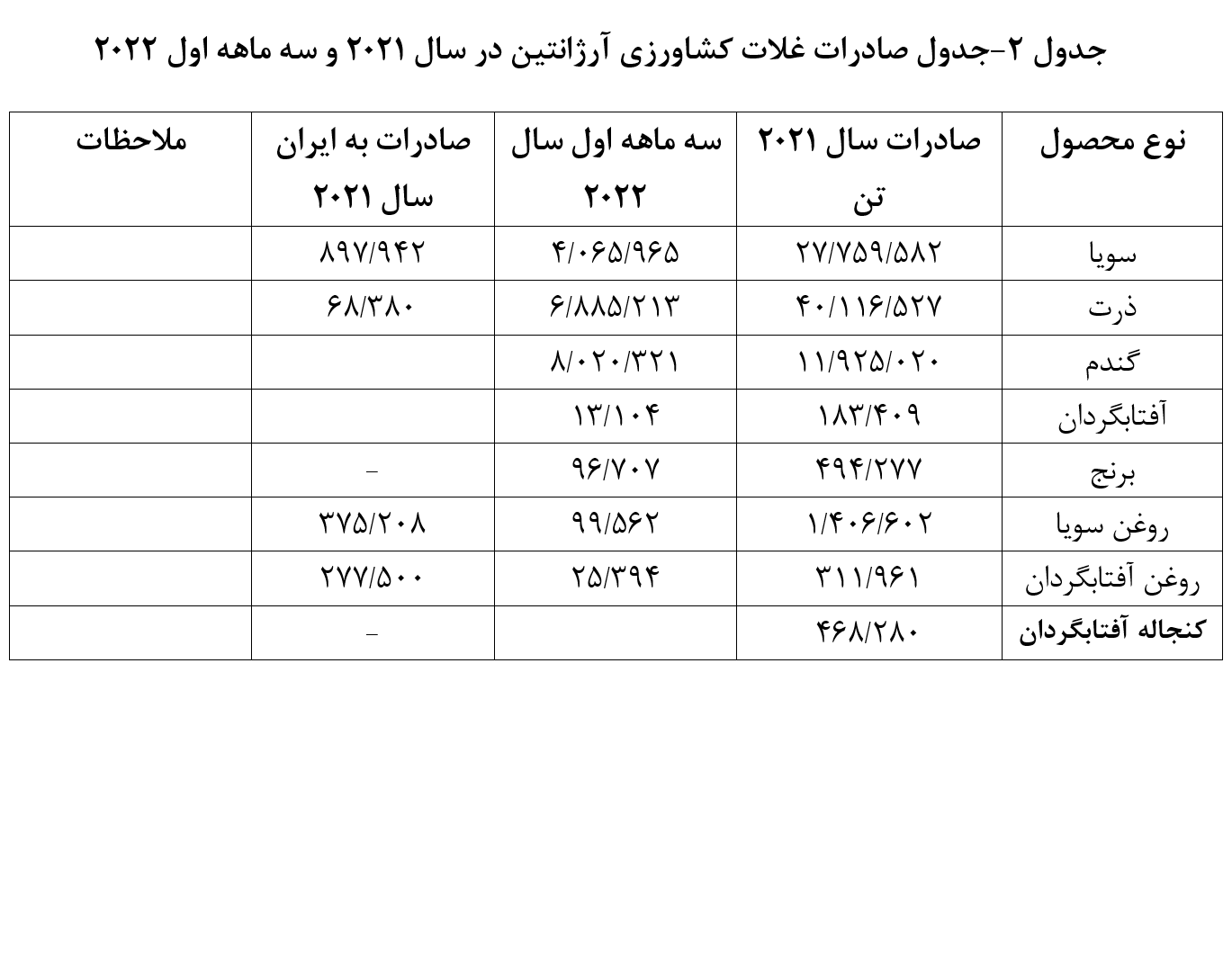 فراتر از بحث تولید، آنچه در شرایط فعلی اهمیت بیشتری دارد ظرفیت آرژانتین در صدور محصولات و فرآوردهای عمده کشاورزی است که کمبود عرضه بین المللی این اقلام سبب اهمیت بیشتر آن شده است. با نگاهی به جدول شماره 2 که شامل ارقام مربوط به میزان صادرات غلات، روغن‌های نباتی و کنجاله محصولات کشاورزی از سوی آرژانتین است می‌توان تصویر بهتری از جایگاه این کشور ارائه نمود.