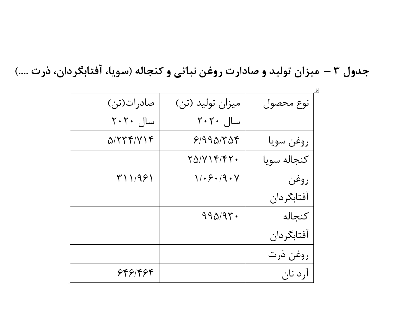 مقایسه جدول میزان تولید وصادرات آرژانتین نشان می دهد بیش از 75 درصد غلات و فرآوردهای کشاورزی آرژانتین با هدف صادرات تولید می‌شوند و طبق آمار وزارت کشاورزی این کشور از میزان 135 میلیون تن غلات تولید شده در آرژانتین در سال زراعی 2021 بیش از 100 میلیون تن آن به بازارهای بین المللی صادر شده است. به موارد مذکور باید نقش آرژانتین در صادرات آرد نان، روغن آفتابگردان و کنجاله سویا و ذرت به عنوان خوراک دام را نیز اضافه نمود که در جدول شماره 3 میزان تولید و صادرات آن ذکر شده است.