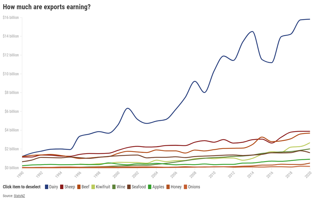 لبنیات اگر چه بزرگترین منبع درآمد نیوزیلند نیست[1] اما بزرگترین محصول صادراتی این کشور به شمار می رود. صادرات این محصول از سال 1990 تاکنون بیش از 231 میلیارد دلار درآمد برای کشور 5 میلیونی نیوزیلند داشته است. در همین بازه زمانی گوشت گوسفند با 71 میلیارد دلار در رتبه دوم و گوشت گاو با 59 میلیارد دلار در رتبه سوم قرار دارند. در رتبههای بعدی میوه کیوی، محصولات دریایی، سیب، عسل و پیاز بیشترین درآمد را در بخش صادرات کسب کرده اند.