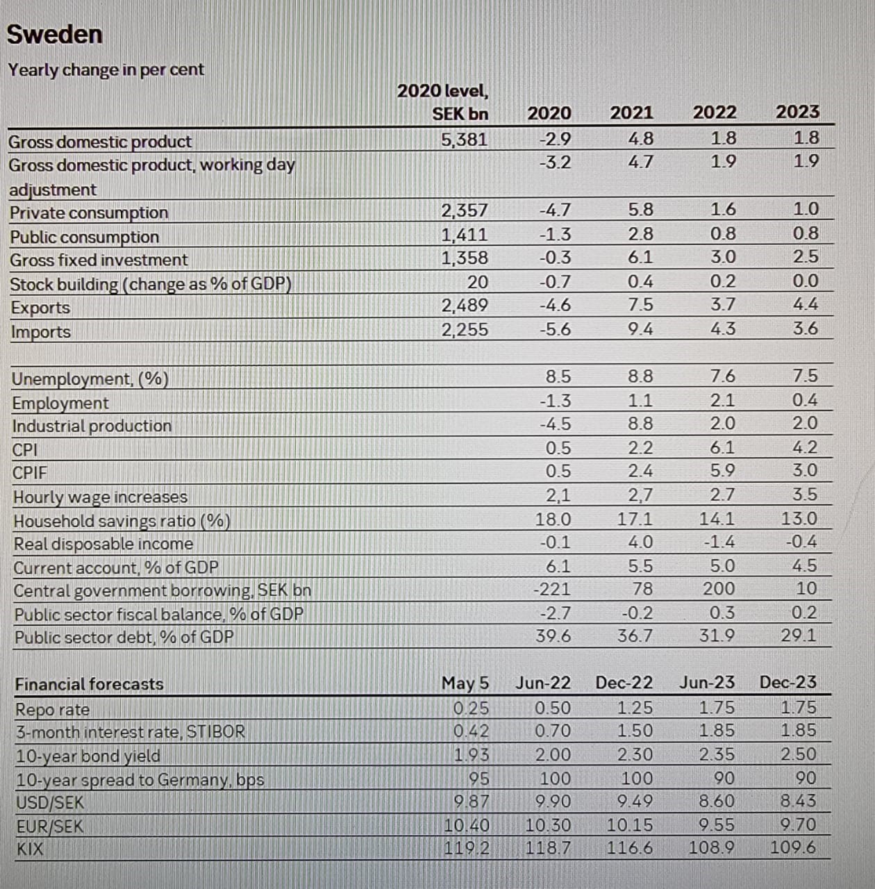 چندی پیش نیز وزارت دارائی سوئد آخرین پیش بینی خود از وضعیت اقتصادی این کشور را اعلام نمود. طبق این پیش بینی انتظار می رود اقتصاد سوئد در سال جاری 3.1 درصد رشد کند که در مقایسه با پیش بینی قبلی 0.3 درصد کاهش یافته است. این به این دلیل است که حمله روسیه به اوکراین بر رشد اقتصادی تأثیر میگذارد. اقتصاد سوئد در پایان پاندمیشرایط بهبود قوی داشته و چشم انداز رشد در سال جاری اساساً ثابت است. با این وجود، انتظار میرود که حمله روسیه به اوکراین بر رشد اقتصادی کشور و سایر نقاط جهان تأثیر بگذارد. میزان رشد کمتر از آنچه انتظار می رفت است، در حالی که انتظار می رود نرخ تورم بالاتر باشد. با این حال، اقتصاد سوئد به لطف منابع مالی قوی عمومی انعطاف پذیر است و وضعیت بازار کار در اوایل سال جاری بهبود یافته است.