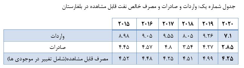 برای دوره 2015 - 2020، میانگین مصرف سالانه فرآوردههای نفتی در بلغارستان نسبتاً ثابت است و به حدود 4.5 میلیون تن در سال می رسد. این کشور تنها حدود 25 هزار تن در سال نفت خام و میعانات گازی تولید میکند که کمتر از 1 درصد مصرف سالانه است. بیشتر نفت مصرفی در کشور در نهایت وارد میشود - یا به عنوان نفت خام و سایر مواد خام که در پالایشگاههای کشور فرآوری میشود و سپس به عنوان محصولات در بازارهای آن فروخته میشود یا به عنوان محصولات تصفیه شده وارد شده از کشورهای دیگر. اطلاعات مربوط به واردات و صادرات نفت خام و فرآوردههای پالایش شده برای دوره 2015 - 2020 در جدول 1 ارائه شده است.