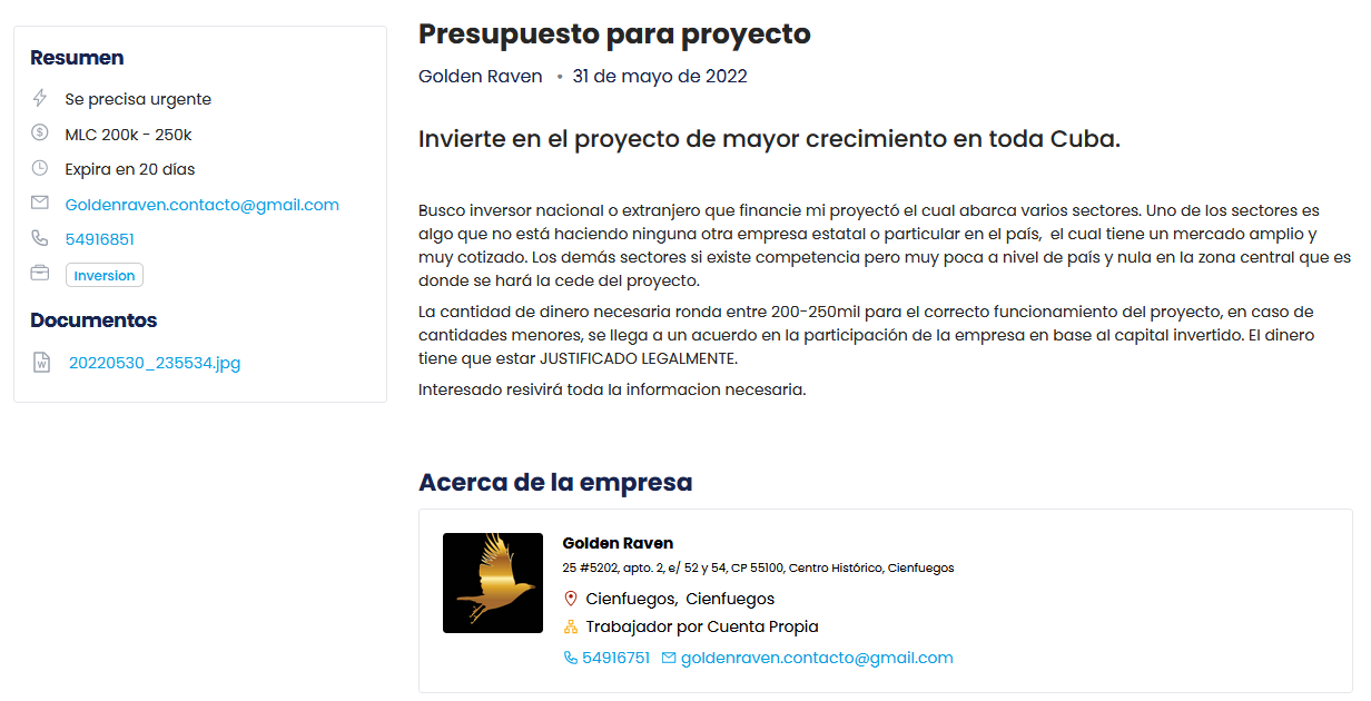به طور مثال در آگهی زیر که در تاریخ 31 می 2022 بارگذاری شده است، درخواست تامین مالی داخلی و خارجی بین 200 تا 250 هزار MLC برای یک طلاسازی خصوصی در استان سین فیگوئس دیده میشود که با فوریت و انقضای 20 روزه معرفی شده است.