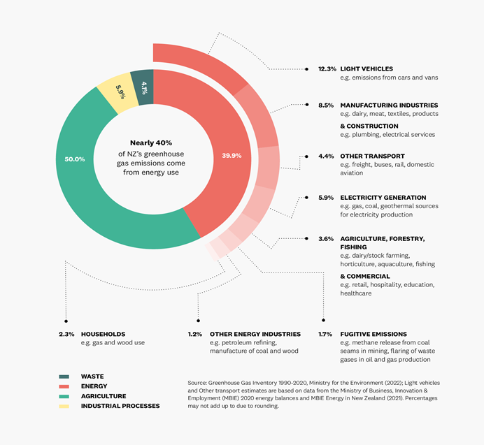 همانطور که گفته شد، حدود 40 درصد از کل انتشار گازهای گلخانه ای نیوزیلند از مصرف انرژی در این کشور ناشی میشود. این گازهای گلخانهای از طریق مصرف سوختهای فسیلی مانند استفاده از ماشین بنزینی یا کامیون دیزلی، سفر با هواپیما، مصرف گاز در پروسه تولید یا سوزاندن زغال سنگ برای تولید برق ایجاد میشوند.