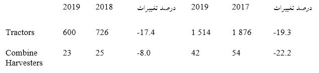 شاخص های سال 2019 نشان می دهند که فروش تجهیزات بزرگ کشاورزی در سطحی بین 5 تا 10 درصد کمتر از 700-600 دستگاه فروخته شده در سال گذشته خواهد بود.