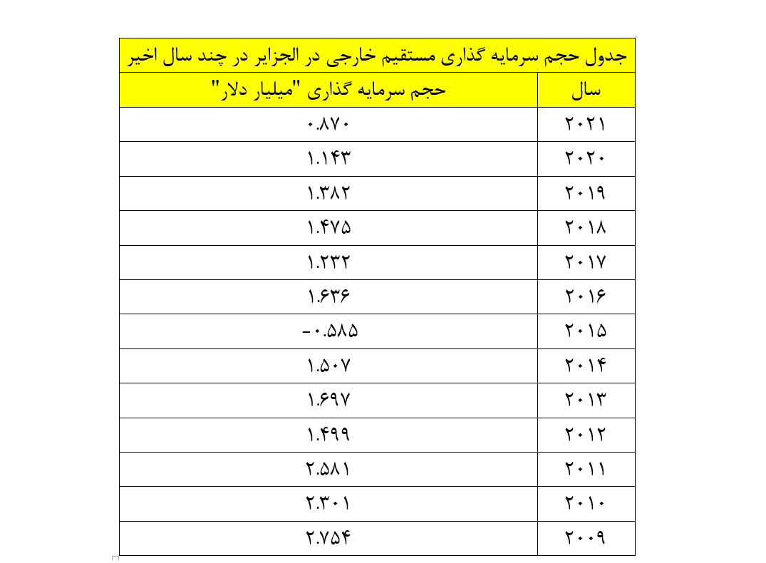 از سوی دیگر میزان سرمایه گذاری الجزایر در خارج از کشور، کاهش یافته و به منهای 52 میلیون دلار در سال 2021 رسیده است. در حالی که این رقم در سال 2020 در حدود 15 میلیون دلار و در سال 2019 در حدود 31 میلیون دلار بوده است. شایان ذکر است که سرمایه گذاریهای الجزایر در خارج از کشور معمولاً ناشی از فعالیت های شرکت سوناطراک میباشد.