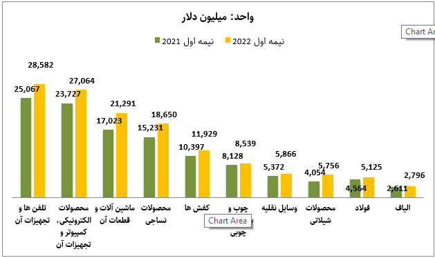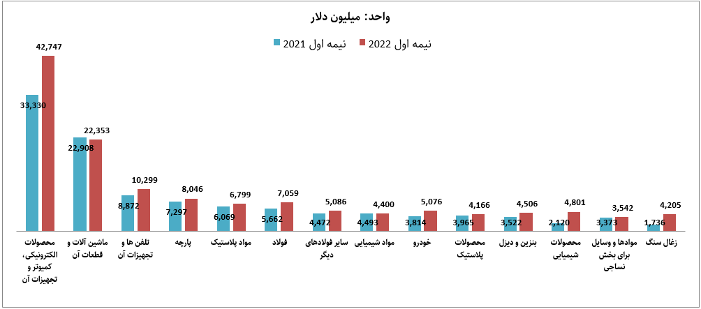نمودار6: اقلام عمده صادرات ویتنام به جهان درنمیه اول 2022 و در مقایسه با مدت مشابه 2021