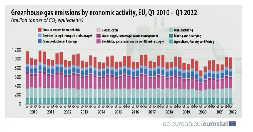 بر اساس دادههای یورواستات، در سه ماهه اول سال 2022، بخش های اقتصادی که بیشترین سهم را در میزان انتشار گازهای گلخانه ای داشتند، خانوارها (24 درصد)، تأمین برق و گاز (21 درصد) و تولید (20 درصد) بودند. پس از آن کشاورزی (12%)، حمل و نقل و ذخیره سازی (10%).
