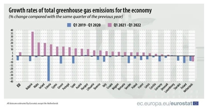 آمارها نشان می دهد که انتشار گازهای گلخانه ای تقریباً در تمام کشورهای عضو اتحادیه اروپا در سه ماهه اول سال 2022 نسبت به مدت مشابه در سال 2021 افزایش یافته است که نشانه ای از بهبود پس از همه گیری است. هلند (-9%) و فنلاند (-1%) تنها کشورهای عضوی بودند که کاهش انتشار گازهای گلخانه ای را در سه ماهه اول نسبت به مدت مشابه سال قبل گزارش کردند.