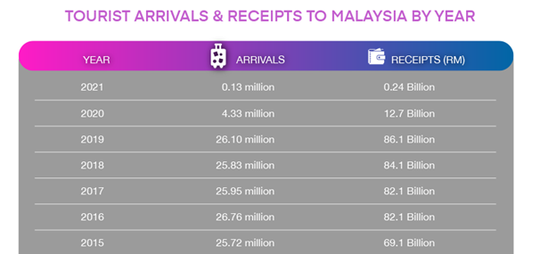 لازم به ذکر است گردشگری تا قبل از همه گیری کرونا یکی از بخش های مهم درآمد زای اقتصاد مالزی بود بگونه ای که در سال 2019 با ورود 26 میلیون و یکصد هزار نفر گردشگر خارجی درآمدی برابر با 20 میلیارد دلار ( معادل حدود 17 درصد از GDP مالزی) به این بخش اختصاص داشت.