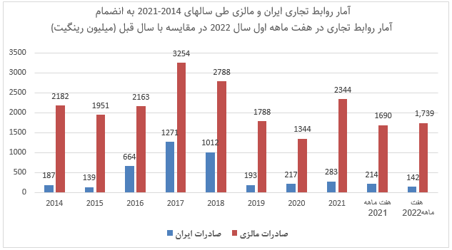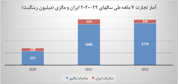 روابط تجاری ایران و مالزی نیز به مانند روند تغییر جهانی تجارت در سال 2021 بهبود یافت و حجم تجارت دو کشور با رشد حدود 68 درصدی از 1561 میلیون رینگیت در سال 2020 به 2627 میلیون رینگیت رسید. لیکن با توجه به پیوند محدود اقتصاد ایران با اقتصاد کشور مالزی، روابط تجاری دو کشور در هفت ماه اول سال جاری نسبت به سال گذشته تغییر قابل ملاحظه ای نداشت و با کاهش 1.2 درصدی از 1904 میلیون به 1881 میلیون رینگت رسیده است. صادرات مالزی به ایران در بازه زمانی مذکور با رشد 3 درصدی از 1690 میلیون به 1739 میلیون رینگیت افزایش یافت. با اینحال نکته قابل تامل در این روند، کاهش 33 درصدی میزان صادرات ایران از 214 میلیون به 142 میلیون رینگیت در این بازه زمانی است. این آمار حاکی از تراز منفی قابل توجه ایران است که عمدتا بدلیل واردات روغن پالم و فراوردههای مختص به آن است.