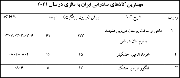 ماهی و سخت پوستان دریایی منجمد و نرم تنان دریایی در مجموع 61 درصد، خرما، انجیر، خشکبار با 16 و انگور تازه یا خشک با 5 درصد عمده محصولات صادراتی ایران به مالزی در سال 2021 میباشند.