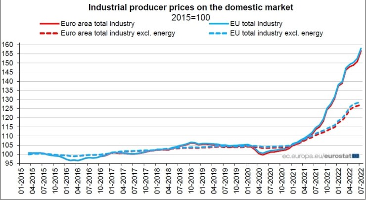 در اتحادیه اروپا، تورم در بخش انرژی به طور سالانه 96.2 درصد، برای کالاهای واسطه ای 21.7 درصد، برای کالاهای مصرفی غیر بادوام 14.8 درصد و برای کالاهای مصرفی بادوام 10.3 درصد بوده است. کالاهای سرمایه ای در سال جاری 8.1 درصد افزایش قیمت داشته است.