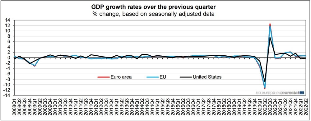 براساس گزارش آژانس آمار اروپا یوروستات در سه ماهه دوم سال 2022، تولید ناخالص داخلی اتحادیه اروپا 0.7 درصد نسبت به سه ماه اول سال افزایش یافت، در حالی که در منطقه یورو این شاخص 0.8 درصد افزایش یافت.