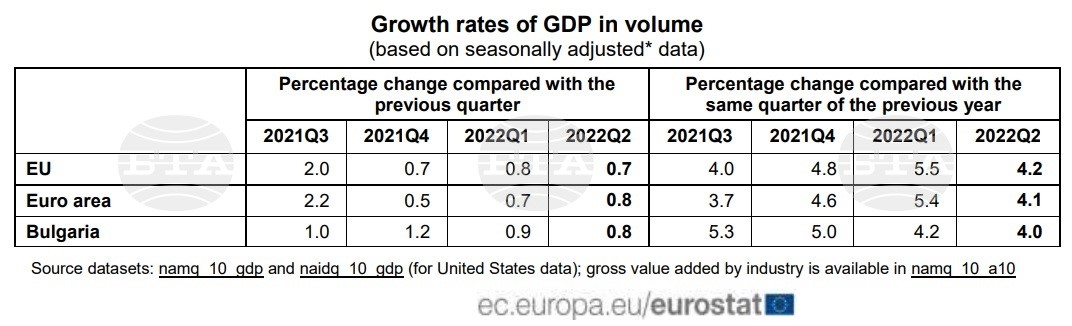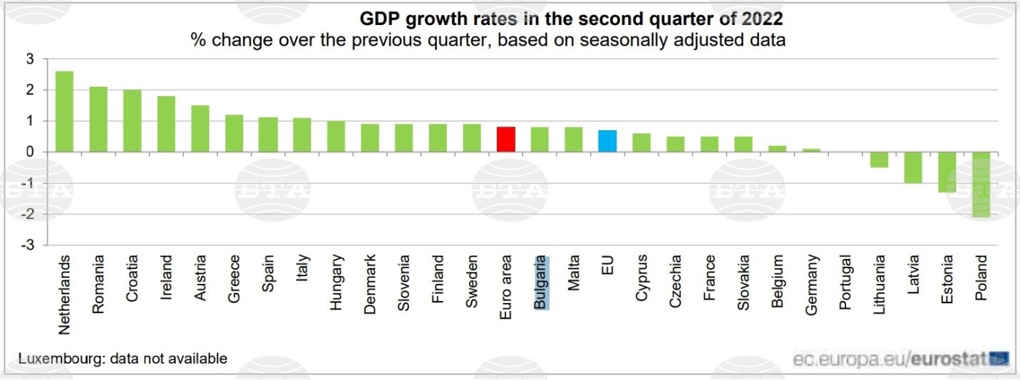 در بلغارستان، اقتصاد در سه ماهه منتهی به پایان ژوئن در مقایسه با ژانویه تا مارس 0.8 درصد رشد کرد. در سه ماهه دوم به صورت سالانه، تولید ناخالص داخلی بلغارستان 4 درصد افزایش یافته است که در مقایسه با 4.2 درصد در سه ماهه اول و پس از 5 درصد ثبت شده در سه ماهه آخر سال 2021، کاهشی است.