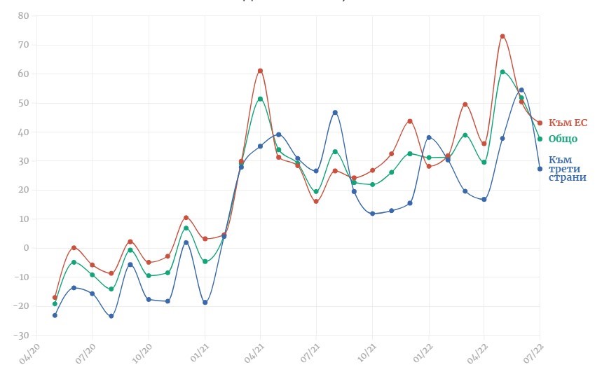 افزایش مورد انتظار در صادرات بلغارستان عمدتاً به دلیل سفارشات اتحادیه اروپا است که به صورت اسمی حدود دو سوم کل صادرات این کشور را تشکیل می دهد و در ماه جولای بیش از 40 درصد رشد کرد. با این حال، رشد صادرات به کشورهای ثالث به طور قابل توجهی کمتر است.