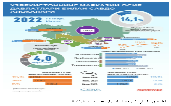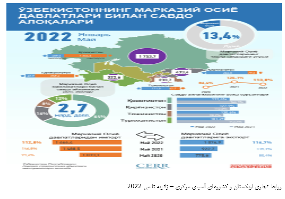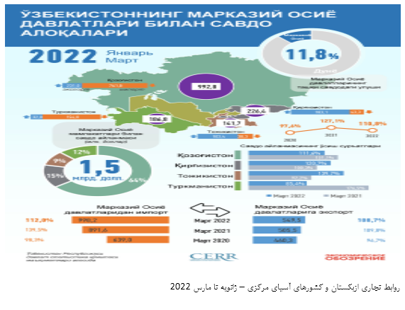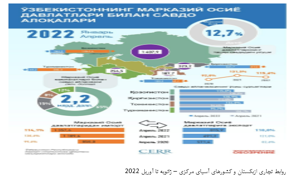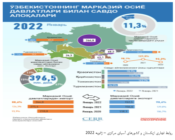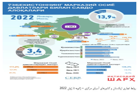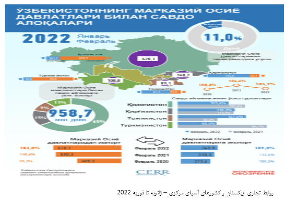 بر اساس آمار منتشره از سوی خبرگزاری جمهوری ازبکستان مورخ 24 سپتامبر 2022 (2 مهر 1401) به نقل از مرکز تحقیقات و اصلاحات اقتصادی این کشور حجم تجارت خارجی ازبکستان با کشورهای آسیای مرکزی از ژانویه تا آگوست 2022 با افزایش 15.6 درصدی به 4.6 میلیارد دلار رسیده است که 14.2 درصد از کل تجارت خارجی این کشور را شامل می‌شود.