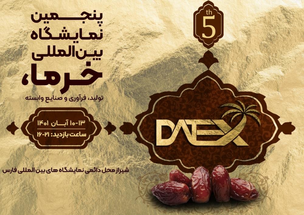 پنجمین نمایشگاه بین المللی خرما، تولید، فرآوری و صنایع وابسته به تاریخ 10 لغایت 13 آبان سال جاری در محل دائمی نمایشگاههای بین المللی فارس - شیراز برگزار میگردد.