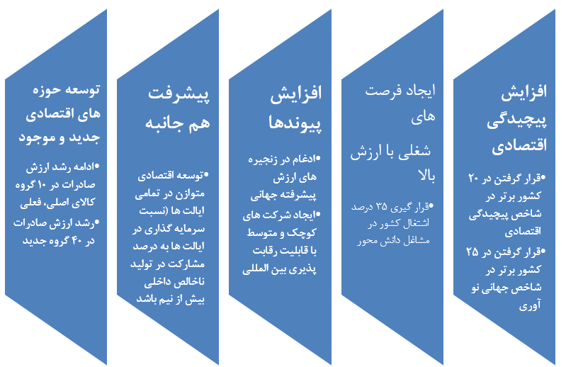 این سند با 5 هدف کلی (افزایش پیچیدگی اقتصادی، ایجاد فرصتهای شغلی با ارزش بالا، گسترش پیوندهای داخلی، توسعه حوزههای اقتصادی جدید و موجود، رشد فراگیر) و مجموعه ای از معیارهای مشخص ذیل هر یک از اهداف تعیین شده است.