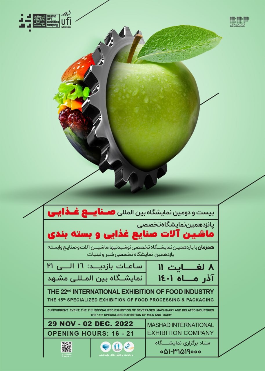 بیست و دومین نمایشگاه بین المللی صنایع غذایی مشهد همزمان با یازدهمین نمایشگاه تخصصی نوشیدنیها و ماشین آلات و صنایع وابسته، یازدهمین نمایشگاه تخصصی شیر و لبنیات و پانزدهمین نمایشگاه تخصصی ماشین آلات صنایع غذایی و بسته بندی از تاریخ 8 لغایت 11 آذرماه 1401 (29 نوامبر لغایت 2 دسامبر 2022) در محل نمایشگاههای بین المللی مشهد مقدس برگزار خواهد شد.