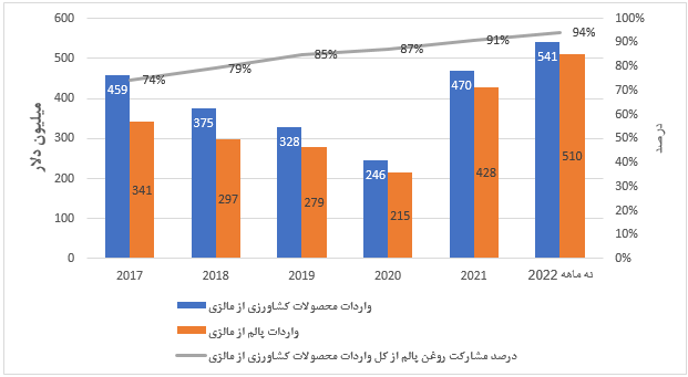 واردات محصولات کشاورزی ایران از مالزی بر اساس آخرین آمار منتشره تا آخر سه ماهه سوم سال جاری میلادی 541 میلیون دلار میباشد. مهمترین محصول وارداتی کشور روغن پالم و دیگر فراوردههای مبتنی بر آن با 510 میلیون دلار 94 درصد کل واردات کشاورزی را تشکیل میدهد. در یکسال مبتنی به آذر ماه سال 1401 میزان واردات روغن پالم از کشور مالزی به صورت قابل توجهی افزایش یافته است.