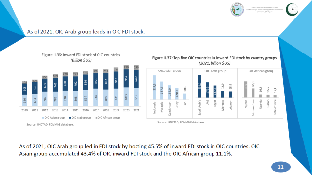 بر اساس گزارش مشترک بانک توسعه اسلامی و مرکز اسلامی توسعه تجارت در مورد فضای سرمایه گذاری و فرصت های کشورهای عضو OIC ، مجموع سرمایه گذاری مستقیم خارجی کشورهای OIC در سال 2021 بالغ بر 132 میلیارد دلار بوده است.