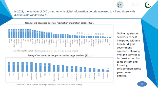 در سال 2021، تعداد کشورهای OIC دارای پورتال اطلاعات دیجیتال به 44 کشور و با پنجرههای تک دیجیتال به 23 کشور افزایش یافت. در عین حال، تجربه قزاقستان در این زمینه به عنوان یکی از بهترینها رتبه بندی میشود.