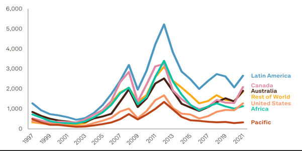 Mining exploration budgets by region, 1997-2021 (Millions USD)