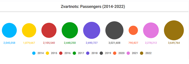 در دوره پیش از کووید و قبل از جنگ، فرودگاه «زوارتنوتس» بهترین شاخصها را در بخش حمل و نقل مسافر به ثبت رساند. در سال ۲۰۱۹ تعداد مسافران ورودی و خروجی در این فرودگاه به ۳ میلیون و ۲۱ هزار و ۶۰۸ نفر رسید. در سال 2020 تردد مسافران در فرودگاه «زوارتنوتس» کاهش یافت و به 790 هزار و 827 نفر رسید. در سال 2021 اوضاع تا حدی بهبود یافت و تعداد مسافران ورودی و خروجی به 2.2 میلیون نفر رسید که در مقایسه با سالهای 2017 الی 2019 کمتر است.