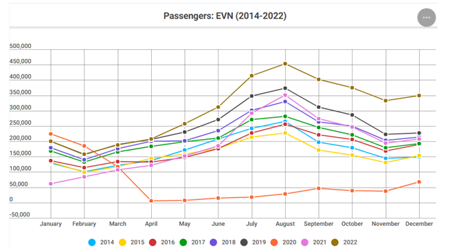 خلوتترین ماه فوریه و شلوغترین ماه اوت بوده است. تعداد اتباع خارجی که در پی جنگ روسیه و اوکراین وارد ارمنستان شدند، به رشد میزان تردد از "زوارتنوتس" کمک زیادی کرد. «زوارتنوتس» از ماه آوریل سال گذشته در مقایسه با سالهای قبل بهترین شاخصها را برای یک ماه به ثبت رسانده است. به عبارت دیگر، طی ماههای آوریل الی دسامبر، «زوارتنوتس» بهترین شاخصها را در سال 2022 داشته است. در طی ماه اوت سال 2022 تعداد مسافران به 453 هزار و 534 نفر رسیده که بهترین شاخص ماهانه «زوارتنوتس» در سالهای اخیر است.
