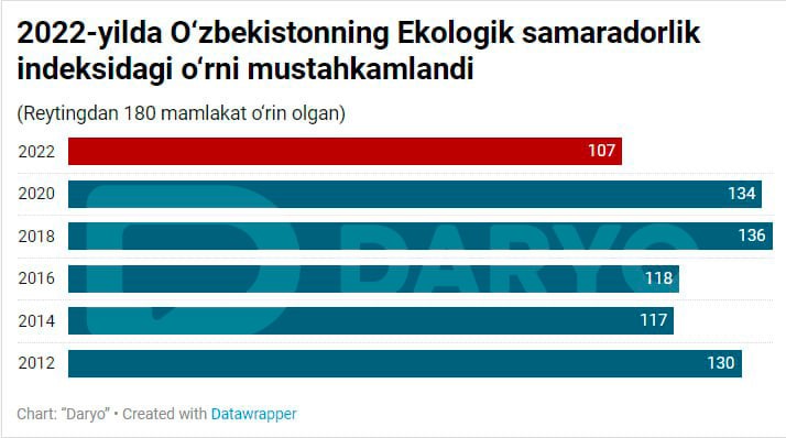 ارزش عملکرد زیست محیطی دولت ازبکستان وقتی خود را نشان می دهد که بدانیم این کشور در سال 2012 در جایگاه 130 این رتبهبندی قرار داشت. در گزارش منتشر شده دانشگاه در سال 2014 ازبکستان رتبه 117 را به خود اختصاص داد. پس از آن سال روند کاهش رتبه کشور در شاخص بهرهوری زیست محیطی آغاز گردید، بطوریکه در سال 2016 میلادی رتبه 118 ، در سال 2018، رتبه 136 و در سال 2020 رتبه 134 جهانی را بدست آورد.