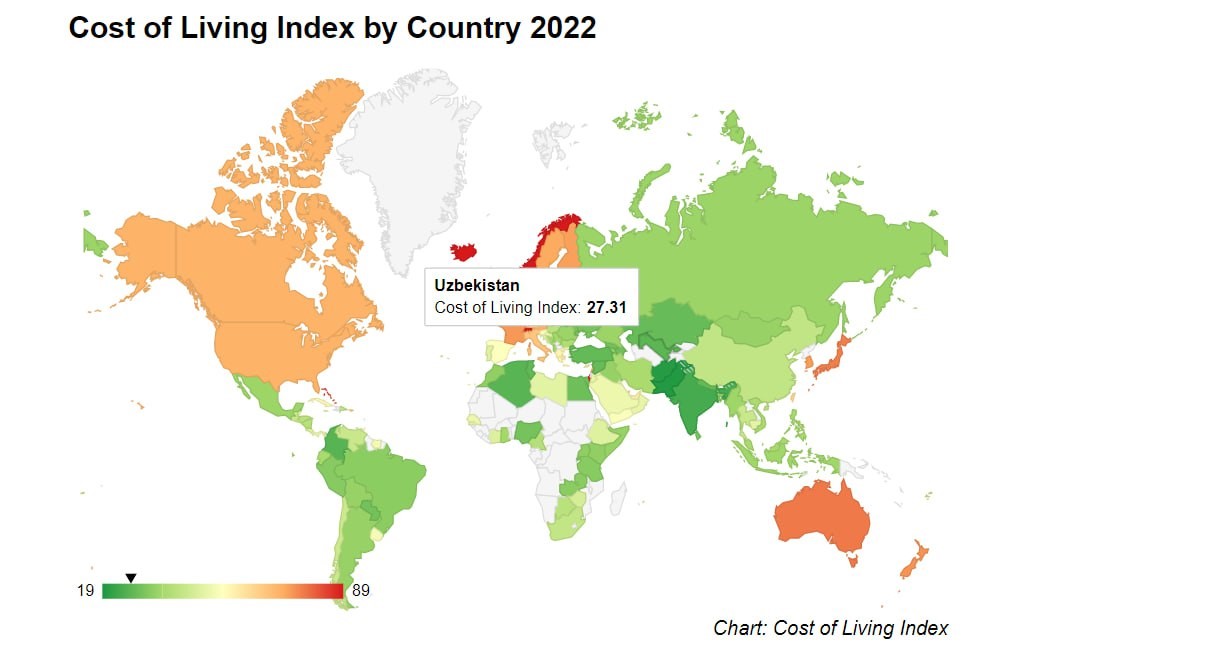 ازبکستان در سال 2022 در بین 139 کشور شرکت کننده در این رتبه بندی با شاخص 27.31 در جایگاه 133 قرار گرفت. مبنای این رتبهبندی مولفههایی مثل اجاره بها، قیمت محصولات غذایی، میانگین هزینه خدمات رستوران میباشد. در این رتبهبندی شهر نیویورک که در هر سه شاخص دارای شاخص 100 است، به عنوان معیار قرار گرفته است. بر اساس رتبهبندی صورت گرفته، زندگی در ازبکستان 72.69 درصد ارزان تر از نیویورک اعلام شده است.