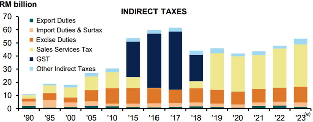 در نمودار سهم هر یکی از بخش ها (عوارض صادراتی، عوارض وارداتی، عوارض کالاهای خاص، مالیات بر کالا و خدمات، مالیات بر ارزش افزوده و دیگر موارد) در بخش درآمدهای مالیاتی غیر مستقیم و همچنین روند آن برای سالهای گذشته به نمایش درآمده است. شایان ذکر است GST و SST دو روش گوناگون جهت اخذ مالیات غیر مستقیم میباشد. در کشور مالزی و تنها در بازه زمانی سال های 2015 تا 2018 نحوه اخذ مالیاتی به صورتGST بوده است.