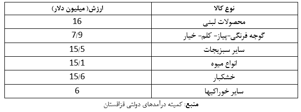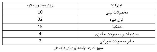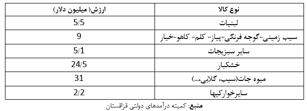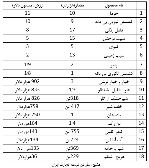 آمارمنتشر شده از سوی دستگاههای داخلی ایران هم جایگاه مهم صادرات محصولات کشاورزی، میوه جات، لبنیات و خشکبار به قزاقستان را نشان می دهد. براساس گزارش منتشرشده توسط سازمان توسعه تجارت صادرات انواع محصولات یادشده از ایران به قزاقستان به شرح جدول زیر بوده است.