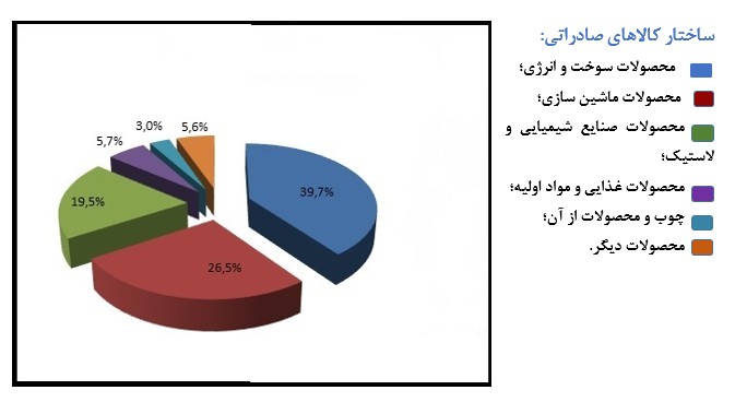 حجم صادراتی سنگ معدنی 784.3 نسبت به سال 2019 میلادی (به ارزش 2.262.1 هزار دلار) افزایش یافته است. حجم محصولات سوخت و انرژی صادراتی 54.2 درصد ( به ارزش 1.047.169.9 هزار دلار) کاهش یافته است.