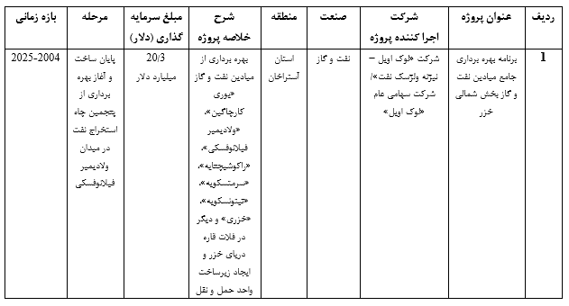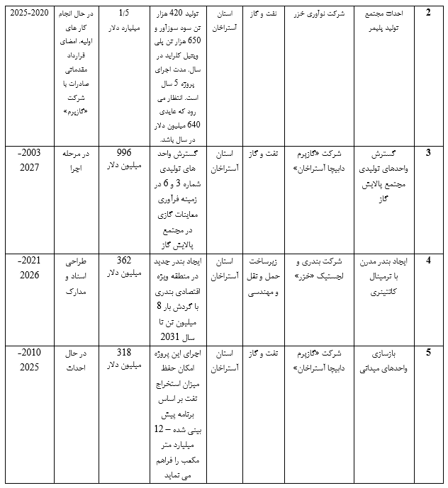 جدول بزرگترین پروژههای سرمایه گذاری استان آستراخان