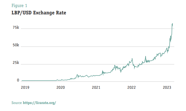 برخی از شاخصهای بحران لبنان، کاهش ارزش پول ملی است؛ به طوری که نرخ ارز پیوسته از حدود 1500 پوند / دلار آمریکا در اکتبر 2019 به حدود 80،000 پوند / دلار در فوریه 2023 با حدود 25 درصد افزایش رو به رو شد. (شکل 1). نوسانات مداوم نرخ ارز، در حالی که روند صعودی ترکیبی تصاعدی را حفظ میکند چالش هایی را برای مشاغل محلی، از جمله تولید کنندگان در زمینههایی مانند حفظ تقاضای مشتری، قیمت گذاری، و حفظ کارکنان را در پی دارد. بانک جهانی نرخ تورم را 150 درصد در سال 2021 و 218 درصد در نیمه اول سال 2022 برآورد کرده است. یکی دیگر از شاخص های نگران کننده رشد منفی تولید ناخالص داخلی است که برآوردها حاکی از کاهش کل در سال 2020 به 20 درصد است (تا سال 2016، و بهبود نسبی در سال 2021، در حالی که همچنان 5 درصد کمتر از سال 2016 است).