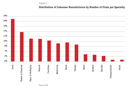 وضعیت تولید در سال های قبل از بحران را میتوان از گزارش انجمن صنعتگران لبنان اینگونه استنباط کرد: کل درآمد بخش تولید لبنان در سال 2015 حدود 8.8 میلیارد دلار بود که حدود 17 درصد از تولید ناخالص داخلی آن زمان را تشکیل می داد. حدود 65 درصد شرکت ها در منطقه جبل لبنان واقع شده اند. از نظر تخصص های اصلی، دادههای این انجمن نشان می دهد که صنایع غذایی با حدود 19 درصد (از مجموع 1077 شرکت) بیشترین تعداد بنگاهها را به خود اختصاص داده اند، پس از آن پلاستیک و مواد شیمیایی با 14 درصد، سپس کاغذ و بسته بندی و مواد معدنی در حدود 11 درصد.