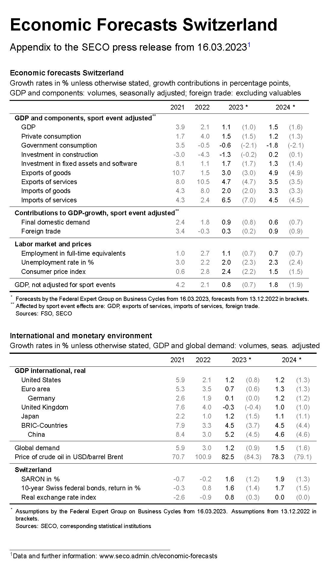 در این شرایط، کارشناسان اقتصادی انتظار دارند که اقتصاد سوئیس در سال 2023 به میزان 1.1 درصد رشد کند (پیشبینی دسامبر، 1.0 درصد بود). این مقدار به طور قابل توجهی کمتر از میانگین است، اما باعث نمیشود اقتصاد وارد رکود شود. این گروه کارشناسی مانند قبل پیشبینی میکند که در زمستان آینده کمبود انرژی گستردهای در بخش تولید رخ ندهد. با این حال انتظار میرود که قیمت گاز و برق برای مدتی طولانی بالا بماند که در مقیاس تاریخی بیسابقه است.