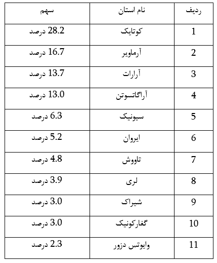 توزیع استانهای جمهوری ارمنستان برحسب سهم از تعداد معاملات خرید و فروش زمین