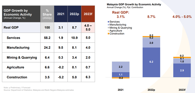 رشد اقتصاد مالزی در سال 2022 علیرغم چالشهای گوناگون و رشد آهسته اقتصاد جهانی، به لطف افزایش هزینههای بخش خصوصی و دولتی (تقاضای داخلی) به عدد 8.7 درصد رسید. این میزان رشد در سال جاری به نسبت تعدیل شده و پیش بینی رشد 4 تا 5 درصدی برای سال 2023 با ادامه تقاضای داخلی قوی و رشد کم اقتصاد جهانی پیش بینی میشود. در بعد داخلی: