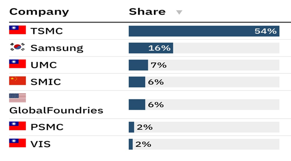 فعالیت هایی که توسط غول نیمهرسانا TSMC اداره میشود با تولید حدود 54 درصد از عرضه جهانی تراشه، برای خودکفایی فنآوری جمهوری خلق چین در فضای نیمهرساناها بسیار مهم است. سرزمین اصلی چین همچنان به خروجی TSMC وابسته است و تقریباً 70 درصد از تولید تراشه داخلی آن به این شرکت بستگی دارد. TSMC سهم بزرگ تولید تراشههای جهانی را در اختیار دارد.