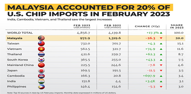 دادههای سرشماری ایالات متحده نشان میدهد که مالزی همچنان پیشتاز واردات ایالات متحده است و 20 درصد یا 972.9 میلیون دلار (4.3 میلیارد رینگیت) از کل واردات تراشه ایالات متحده در فوریه 2023 را به خود اختصاص داده است. با این حال ارزش صادرات تراشه به ایالات متحده از فوریه 2022 به میزان 26.3 درصد کاهش یافته است. ارزش کل واردات تجهیزات الکتریکی و الکترونیکی ایالات متحده از مالزی در سال 2022، 31.09 میلیارد دلار (137.03 میلیارد RM) بود.