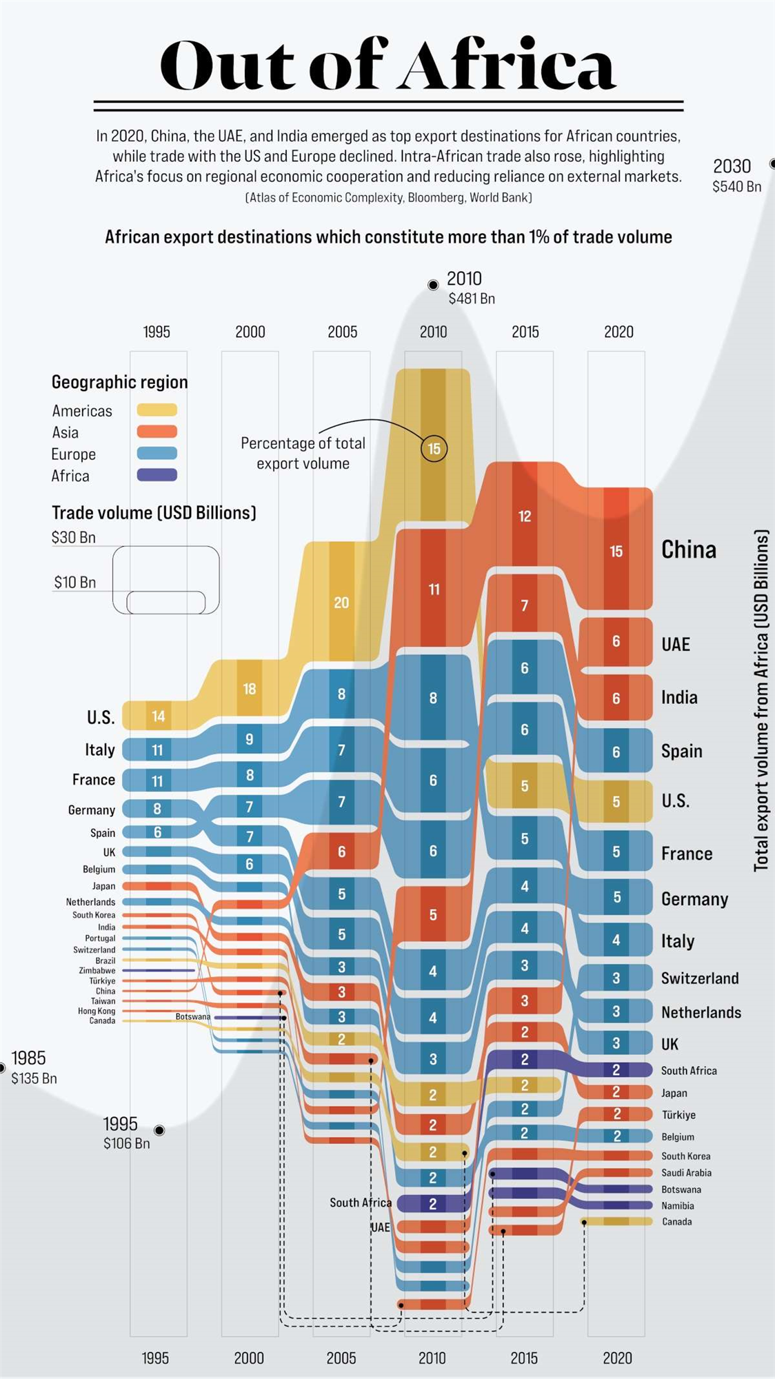 در سال 2010 که ارزش صادراتی محصولات آفریقایی از 481 میلیارد دلار (سالانه) عبور کرد، بازار جهانی به سرعت شروع به تغییر نمود. در آغاز این رشد مرهون افزایش تولید نفت و گاز طبیعی بوده است و البته در این سال ایالات متحده واردات نفت از آفریقا را کاهش داد، و همزمان چین به عنوان بخشی از راهبرد کلان ژئوپلیتیکی خویش فعالانه در جستجوی منابع و فرصتهای سرمایهگذاری در جهان در حال توسعه بود.
