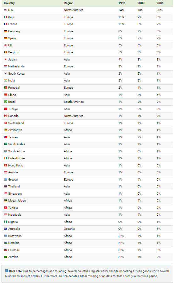 در دوره زمانی 1995 تا 2005 کشورهای اروپای غربی – ایتالیا، فرانسه، اسپانیا، آلمان، بلژیک و انگلستان – نیز سهم قابل توجهی از صادرات قاره آفریقا را شامل میشدند که بخشی از آن ناشی از روابط صدساله و میراث استعماری است، اما بخش دیگر آن به مشوقهای منبعث از ابتکاراتی همچون کنوانسیون لومه [2]1976 بر میگردد که بر مبنای آن به عنوان نوعی کمک توسعهای، تولیدات کشورهای در حال توسعه آفریقایی (به ویژه مستعمرات سابق) امکان دسترسی معاف از عوارض را به بازارهای اروپایی یافتهاند.