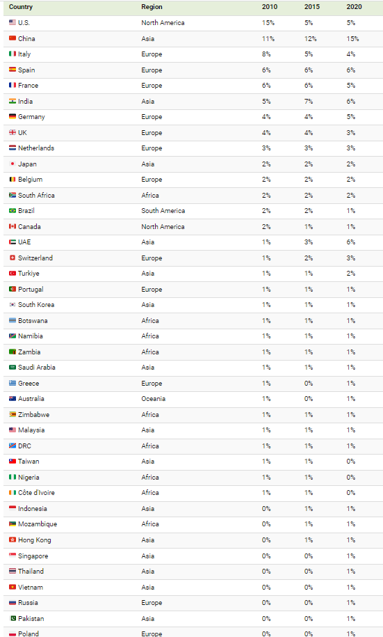 تصویر ذیل کلیه کشورهایی که سهم یک درصدی یا بیشتر از آن را به لحاظ ارزش صادراتی محصولات قاره آفریقا در طول 2010 تا 2020 به خود اختصاص دادهاند را نشان میدهد.