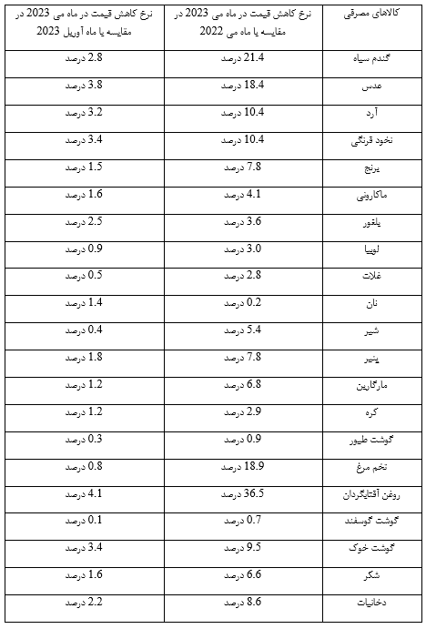 به طور کلی، قیمت مواد غذایی و نوشیدنیهای غیرالکلی در ماه می سال 2023 در مقایسه با ماه می سال 2022، 2.1 درصد و در مقایسه با ماه آوریل 2023، 4.1 درصد کاهش یافته است.