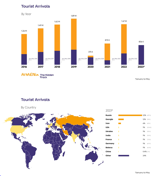 در 5 ماهه نخست سال 2023، 806 هزار گردشگر از ارمنستان بازدید کرده است. 52 درصد یا 417 هزار از روسیه، 12 درصد یا 94 هزار از گرجستان، 6 درصد یا 45 هزار نفر از ایران وارد ارمنستان شدهاند.