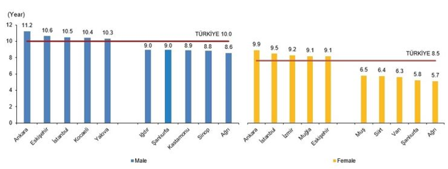 در سال 2022، شهری با بالاترین میانگین سال تحصیلی برای جمعیت 25 ساله و بالاتر، آنکارا با 10.6 سال بود و پس از آن استانبول، اِسکی شهیر، کوجایلی و ازمیر قرار گرفتند. از سوی دیگر، شهری با کمترین میانگین سال تحصیلی، آغری با 7.2 سال و پس از آن به ترتیب شانلی اورفا، وان، موش و کاستامونو قرار دارند.