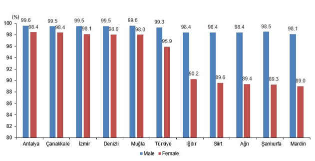 استانهایی که بالاترین نرخ باسوادی را برای زنان داشتند، آنتالیا و چاناک کاله بودند.