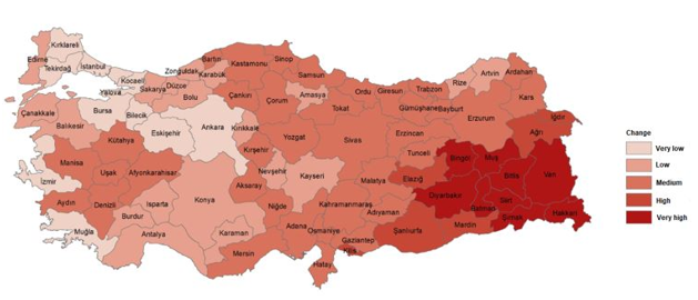 شیرناک، حکاری، وان، سیرت و موش پنج استان برتری بودند که نرخ باسوادی در آنها بالاترین افزایش را بین سالهای 2008 و 2022 نشان داد. پنج استان اول با کمترین افزایش به ترتیب اِسکی شهیر، آنکارا، یالوا، استانبول و بیلجیک بودند.